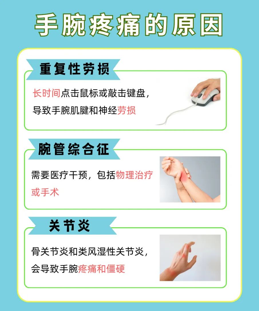 长时间使用手腕,如打字、玩游戏、做家务等,都可能导致手腕肌肉和关节劳损,从而引发疼痛。除此之外,还会有某些疾病因素,如腱鞘炎、关节炎等,也可能导致手腕疼痛。